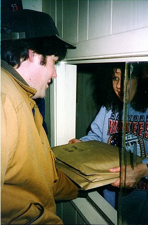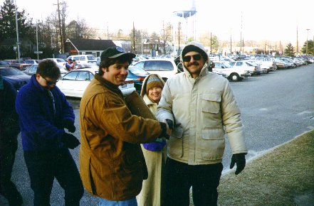 We took many pictures of this historic moment before my father in his Red Sox cap and I in my Rockies settled in to wait for our gifts from the gray haired man. My father, being the devoted Lammana krishna that he was, became quite excited to learn that the great numbered predictor was in our midst. I introduced myself to John, then introduced my father as "Jim Sr. Lamannakrisna". (Just where do those mmmandnnns go?) Seeing my father's embarrassed smile, John graciously allowed himself to be photographed in public. We met his friendly wife, took more pictures and thanked him for his fine products. Resuming the wait in sub-arctic temperatures, we exchanged pleasantries with our fellow clattering teeth lunatics.